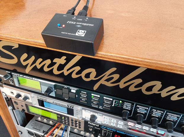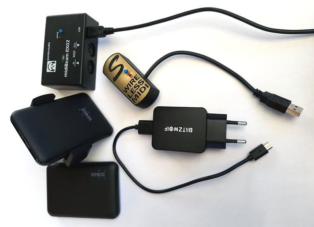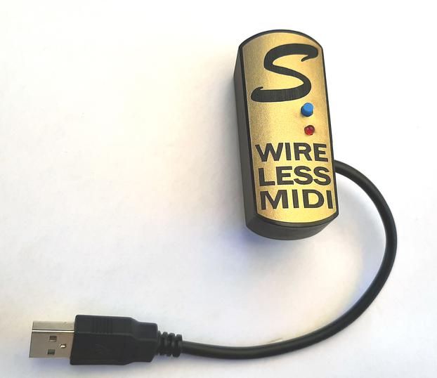 The Wireless MIDI System "Compact" enables the Synthophone to be played wirelessly. The *Compact* transmitter is connected to the MIDI socket at the front of the instrument. A bracket that can be plugged into the side of the Synthophone, holds a USB power bank in place, which supplies power to the "Compact" transmitter. This enables cable-free playing for up to five hours.